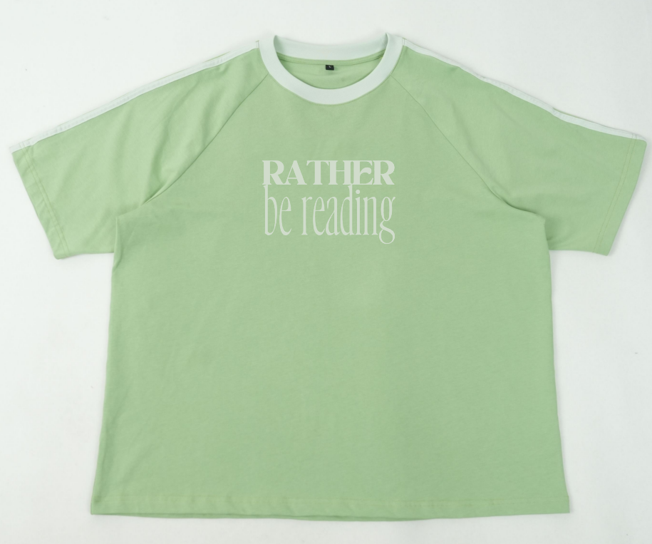 Made from 100% high quality cotton this light (210GSM) and roomy mint green shirt is decked out with a pale green colour and stripes on the sleeves. The slogan "Rather Be Reading" is puff printed.